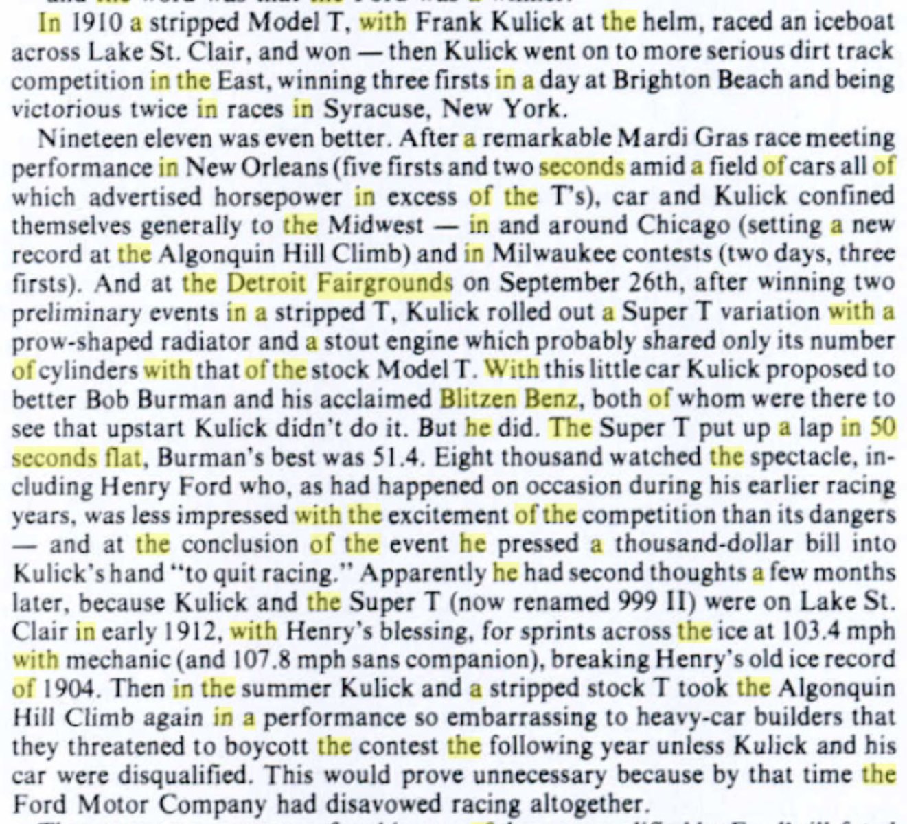 Kenneth, I've searched exhaustively for corroboration of the "we're not building trucks" and denied entry to the Indy 500. I think just like the "five teets" comment, it didn't happen. Of course I may be wrong, but press reports of the day just didn't carry it, and newspapers carried most things Ford related. There was one incident where Ford was denied entry because it was too light, but that was to the Elgin road race in 1910. That and the incident in France in 1911, in which almost the same thing happened, with the Ford Special being denied a start just prior to the race, due to it not being strictly stock, and being underweight. When reading the article below, two Fords, stripped down, were entered. Kulick's racer was 75 lbs. lighter than the other Ford. My suspicion is that Kulick may have been driving one of the small Ford Specials, which may account for the lighter weight: