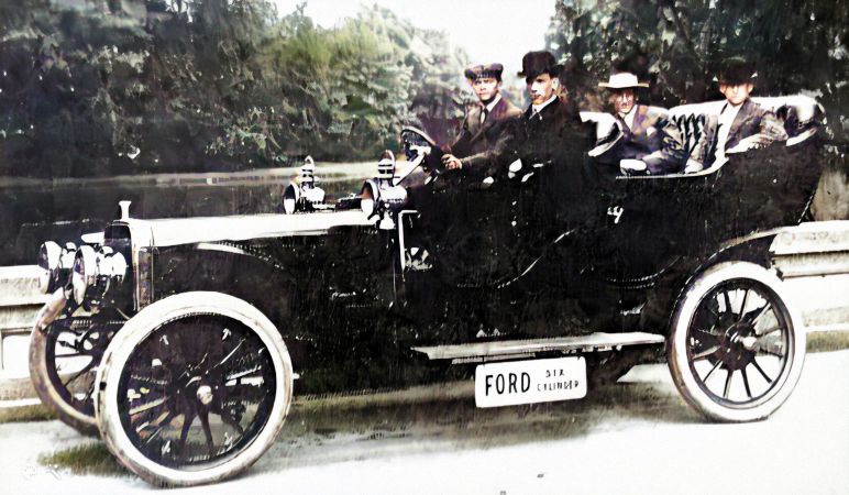 In front of the New York Ford Branch, Henry Ford driving, I believe R.P. Rice beside him (spelling?), James Cousens back left and Gaston Plaintiff, NY Branch Manager beside him. The reflection in the mirror is a K roadster parked behind the K touring: