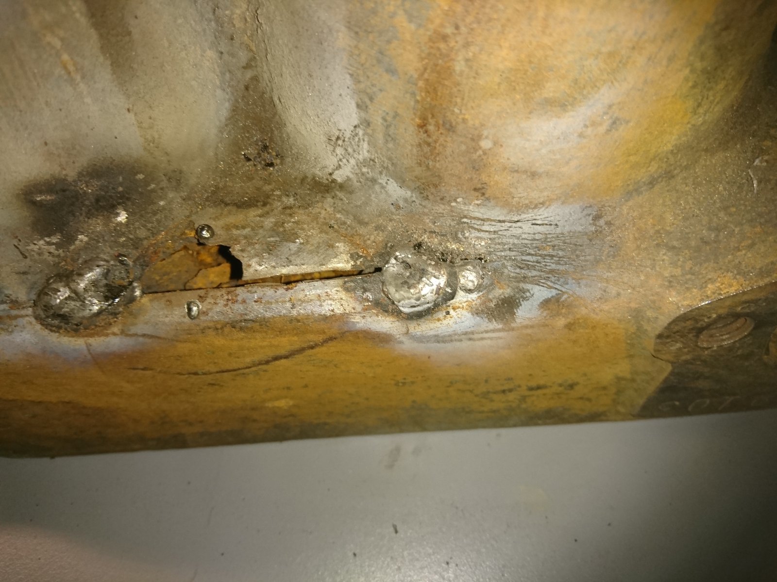 I was recomended a company to weld a crack in my engine block. When he started welding he quickly found out that the steel was rusted thin. Apparently there was something sticky fluid inside the cooling channel that caused this. This is at the top of the engine block.
