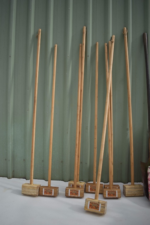 Here's a picture of the mallets. We made them with laminated bamboo shafts and glue-lam heads cut down from ceiling beams. The ball is a regular fit-ball which we filled with about 500ml of water so that it would have some weight. We went through three balls during the game as they don't like being run over (or getting stuck on the exhaust underneath the car!)