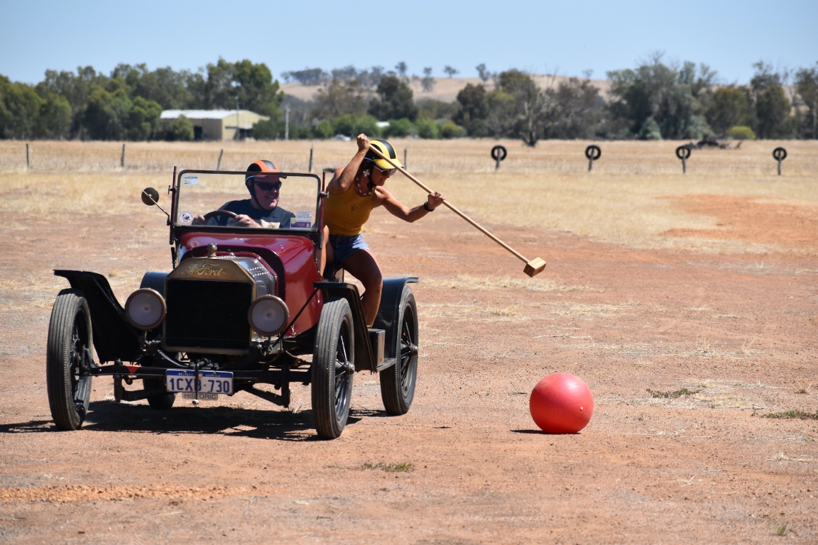 The arena was a 300 yard long strip of airfield 50 yards wide. The gravel surface made it ideal for sliding sideways during the game. Six Ford Model T speedsters were lined up and six “malleteers” joined them to hit a fit ball to either end of the field. A goal was scored when the ball crossed the line. We planned a game comprising two teams of three cars. With two cars from each team on the field at the same time, we could recreate the original sport. The ball was a small rubber fit-ball of 35cm diameter.