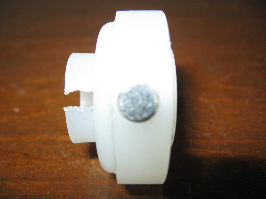 A closeup picture of the white plastic, a reference dimension, notch and pin hole relative positions to magnets and rotor shaft, number of magnets, rough sizes, that they are rare earth neodymium, flush, and type of NS polarity pointing outwards to a needle compass ! I can now Make it !