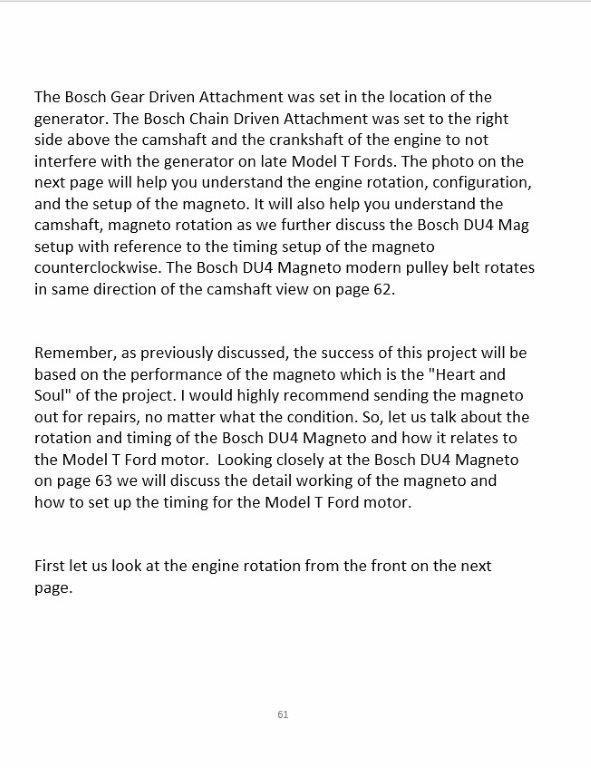 I thought a lot about your posting before giving you a reply. The reason I started this thread and wrote my book was because of the performance of my 1926 Tudor. It was running on the battery, magneto, coils, and a timer when it shorted-out when running on MAG. After investigating there was more than one possibility to fix the problem. Note, I like running on Ford Magneto because the motor sounds great and it was smooth in its performance, so it was important for me to find a solution this problem and build a fix. Yes, I also like shiny carburetors and own two Brass Zenith s4bf carburetor and built an attachment to the 1910 Bosch bracket. What is important to me is that the items I put on my car were available and are period correct for the Model T Ford years. I have deviated from the original equipment on the Model T Ford for motor performance, safety for myself and others, and improving quality of item being installed on the car. For example, I built and installed oak floorboards, and created my own upholstery, installed Colorado Disc Brakes on the rear of the car. During my search, I read a book “1910 Bosch Magneto for Ford cars.” It opened my eyes for a fix for my car, but the Bosch setups have their own problems, gears built in 1910 that wear out, noise, require lubrication, whipping, stretching chain, throwing oil, dirt, mud, breaking chain, and it was not safe. The thing I remember learning from the automobile class in high school was how important to have a good compression, good gas flow, and a hot spark. Two of the items, gas flow, cylinder compression was ok on my car. The third would require me pulling the engine and fixing the magneto which I did not want to do because the best fix would require me sending it to a professional to rebuild the magneto and the engine. That is when I decided to do my homework for a fix using a Bosch DU4 Magneto. The 1910 Bosch Magneto book talks about eliminating timer, coils, mag wire soaked in oil, and battery not needed to start or run the motor. You also get a hotter and quicker spark, cleaner spark plugs, eliminates misfiring at low and high speeds, motor runs smoothly and efficient at both low and high speeds, more power and speed, low throttling of motor, cooler running engine, and better gas mileage. I found all these things to be true after building my Bosch DU4 Magneto pulley belt setup. I thought about manufacturing a pulley belt setup but realized that I was too old at 78 to complete this project during my lifetime, so I decided to write a book “Who D.A.T. Ignition System” to explain the process.
