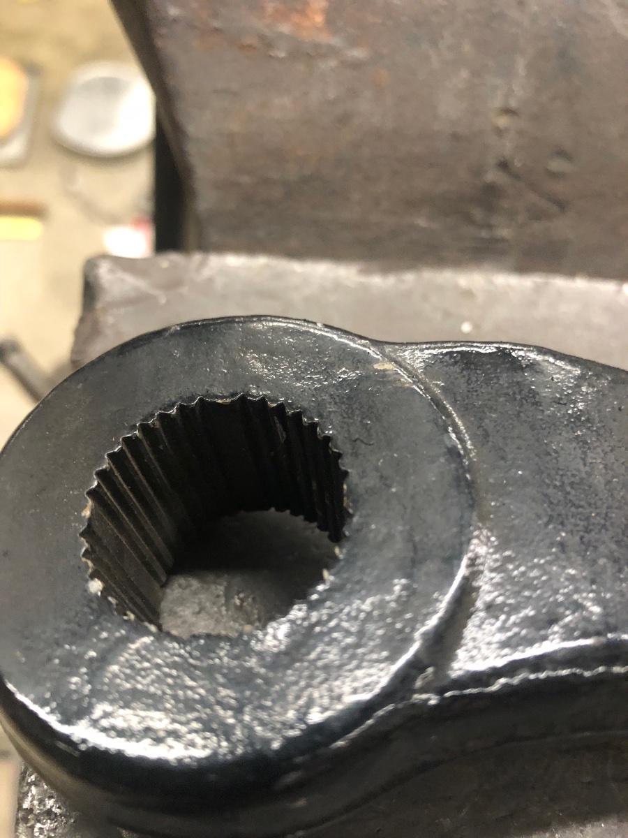 As you can see from the photos, the silver overseas made pitman arm slides way to far onto the shaft and wiggles, (not good). There are 90 degree master index notches on the originals, but you can if needed use a triangle file and re-index the factory pitman arm.