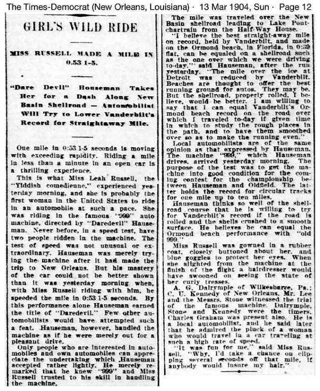 I wondered about that aspect of the story. In all seriousness, Henry Ford's 999 was still commanding headlines. Barney Oldfield was the first to go under 60 seconds on a one mile track with the racer, then Henry Ford sets the world record mile time, beating the old record by 6 seconds, and then propelling Leah Russell at 68 mph.