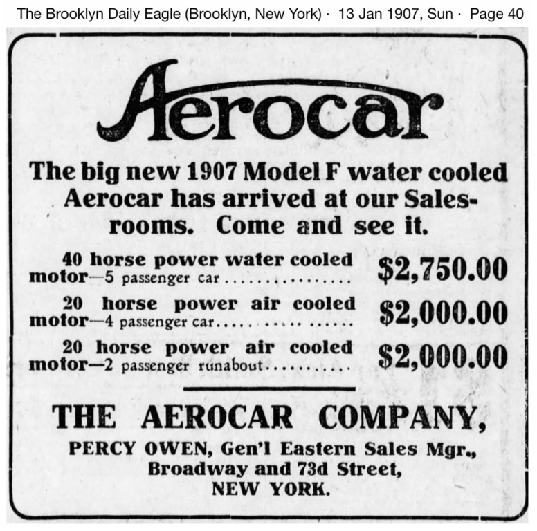 This advertising appeared in the April 22, 1906 New York Sun newspaper. Both Ford and Aerocar advertised their new models for 1906. The first Model K were delivered in April, and by June deliveries rose to 100 in a month. I don't know what Aerocar's early production/deliveries were, but we do no Aerocar only took a little over 300 of the Reeves air-cooled motors between 1906 and 1908. Aerocar added a larger 40 hp water-cooled touring car and roadster to the 1907 and 1908 model line.