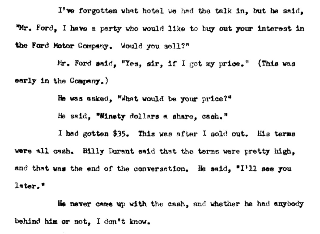 This portion of the reminiscence regard Bennett arranging a meeting between Henry Ford and William Durant in regard to Durand (General Motors) purchasing Henry Ford's interest in FMC. During this portion of his reminiscence (Bennett had already said he sold his stock to Malcomson in 1906, because Malcomson told Bennett it would give him (Malcomson) greater bargaining power as he was fighting FMC regarding his leaving the board). Bennett reports receiving only $35 per share. Earlier he had reported receiving back more than he paid in for his FMC stock. Is it possible Malcomson played the other small investors he had been so concerned about in his letter to the FMC board of directors? If so, a little duplicity by Malcomson. It's something that is worth investigation for a serious historian. Anyway, another mystery from the first days of FMC.