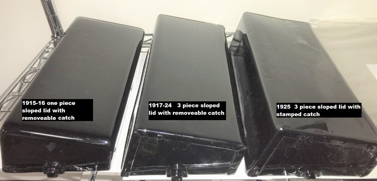 Caution on some of the reproduction slant top lids that have the sides and internal shelf spot welded which caused t he sides to warp. The shelf on the underside of the lid is what keeps the coils in place.
