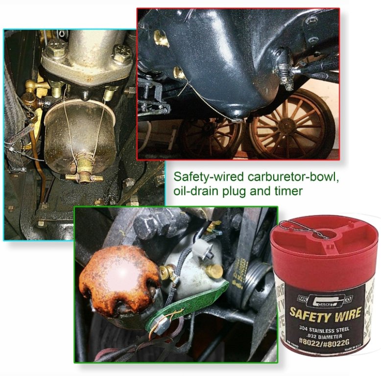 Back in the days when I flew airplanes, I learned about how safety-wire was good for holding such things together as the FAA and I would rather not have vibrate loose and come apart. And so, it wasn't long after buying my Tin Lizzie that the carburetor bowl and drain were safety-wired.