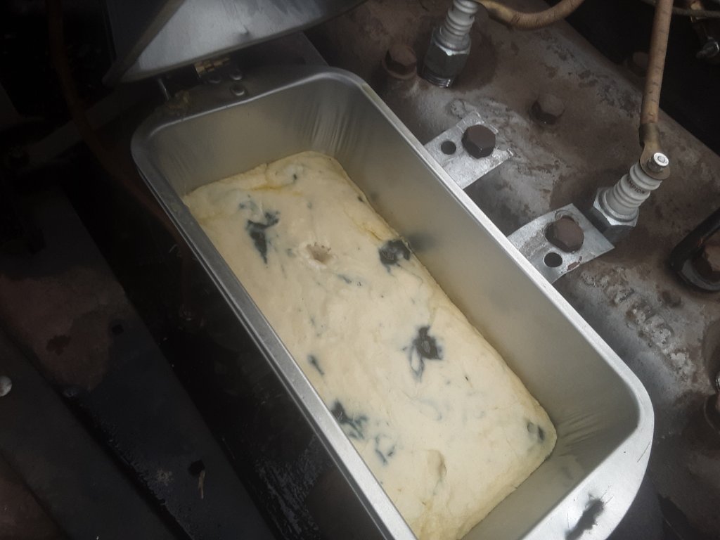 3. Fill 3 greased and floured 28-ounce cans to half full (remove paper labels from cans before starting the baking process).