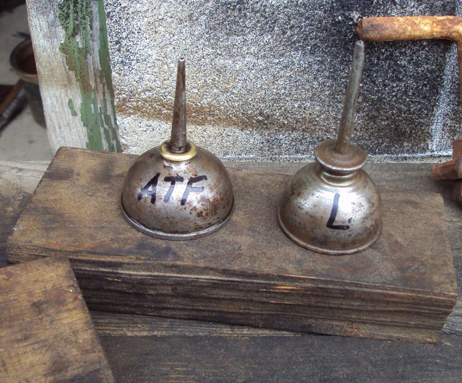 I found two of those cutesy little oil cans that we just have to pick up and the swap meet and put lacquer thinner in one and ATF in the other. I have been filling the oilers each day as they will take it. Today I can turn one spindle bolt a full turn and the other about a half turn. This gives me hope that eventually oil will get to the bottom bushing. Maybe I can lock it in place with the vice grips.
