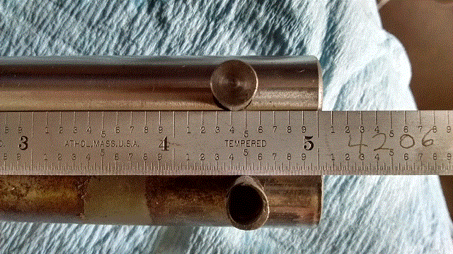 I discovered (with hog's head off) that the inside edge of the base of the pedal's casting would hit the outside boss of the hog's head when the inside cam was only about 1/2 way engaged. You never want the entire cam to be used up, but total physical travel of the pedal sans band should not be limited to 1/2 of the pedal's potential throw on a new cam. I cannot remember the "throw" but I recall that my other 3 cars could slide the shaft "in", let's say...5/8". In other words, the band could be made to constrict a considerable distance. With the new shaft, the slide motion was only about 1/2" before the pedal would bottom out hard, so the potential "squeeze" on the low band would be greatly diminished relative to all my other cars. I then compared the distance between the cam's drilled hole vs the pedal's drilled hole (for the rivets) and found the new shaft had the cam hole at least .090" closer to the pedal hole. In the first photo you can see where I put a dowel pin through both "cam" holes to establish a "zero" datum, then measured the distance from the center of those holes to the center of the pedal hole. In the second photo, you can see that the new shaft is "shorter" than the old one. This can manifest itself in real problems.