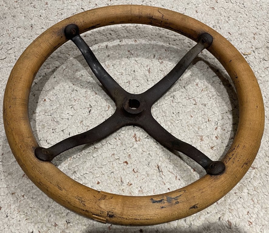 I am always looking for parts. Came across this on CL today and picked it up since I would like to have the smaller wooden steering wheel. Based on data from the the encyclopedia, I am guessing it is between 1912-1920. It is iron spider and wood wheel. It has T902B stamped part number. It also has what looks like trade mark - W ? It measures 15 OD - 12 3/8 ID and 1 3/8 thick.