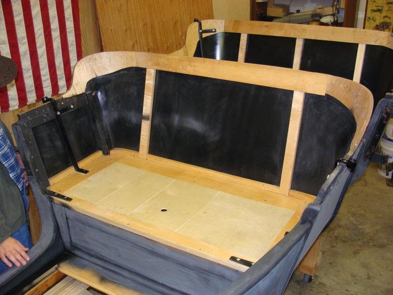 The black that you see is the painted surface of the inside of the sheet metal. It was painted (along with all the body irons) before the woodwork of the backrest was done. The outside of the sheet metal was left in grey primer, which I re-painted with black primer, before painting the car with midnight blue.