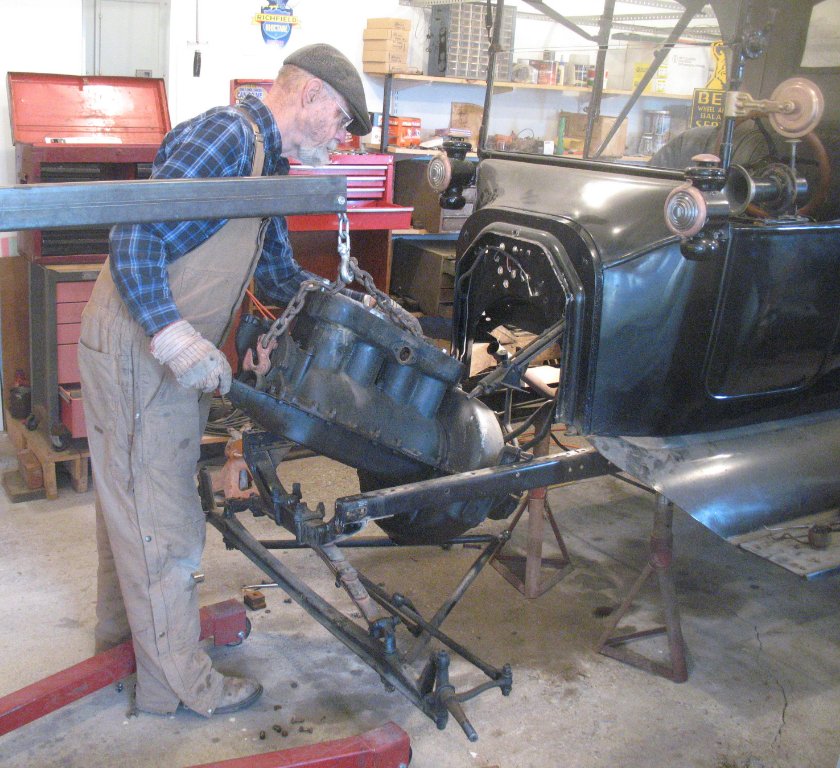 I've never done it with an Improved Car, but many times with a 1915 and a 1923. Never had any help. Radiator off, steering wheel pulled back and sitting on the seat, wishbone loosened and dropped. I have to raise the body a couple of inches on the 1915. Later cars shouldn't need that. Nose way up, tail way down, pedals clear the firewall.