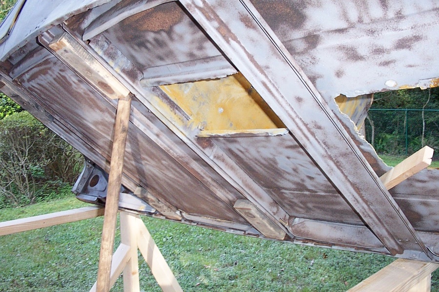This photo shows underside of the rear deck, you can make out the frame edges bent into the sheetmetal for receiving the battery lid. Cutaway is the metal plate due to rust out, that plate covers the rear crossmember.