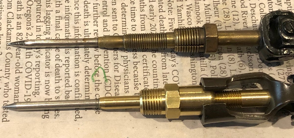 The needle is also about of thread. Might take a combination of getting the nut deeper, the friction tabs shortened & even a little counterbore to the top of the nut. Repo parts!Scott_Conger wrote: ↑Sat Aug 14, 2021 8:30 pmI won't edit my reply, but looking at your photo again, I absolutely agree with Dan. The fit of the part now is nominally OK and I was quick to judge otherwise. Comparing earlier photos of the length of the needle with/without the nut shows that grinding off perhaps 3/32" off the end of the grip fingers will allow somewhere between sufficient and ample room to allow the needle to seat.