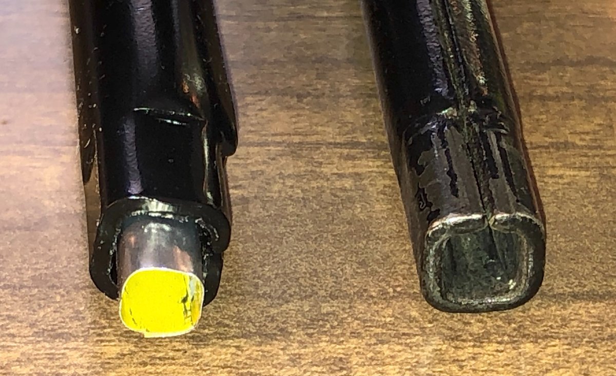 Thin long taper needle of newer repro on top.