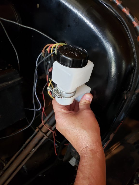 To close the loop here. I didn't have to drill a hole. I replaced the steering column mounting bolt with a longer stainless one and stacked two nuts to space the bracket out for clearance on the firewall (see pics). Just need to check adjustment and bleed then done! According to the seller, the reservoir is a 1920s accessory commonly used on Chryslers. I don't know but it fits well under the hood and looks terrific!