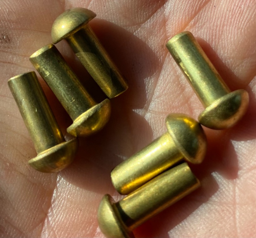 Step 4; We repeated the above steps on the other 3 rivets. However, one of the six rivet holes had worn to an oval larger than Chaffins oversized rivets would snuggly fit so, for that one hole, we drilled a larger “rounding hole” and Saint Westminster turned a custom XXL rivet from a piece of brass bar (pictured below).