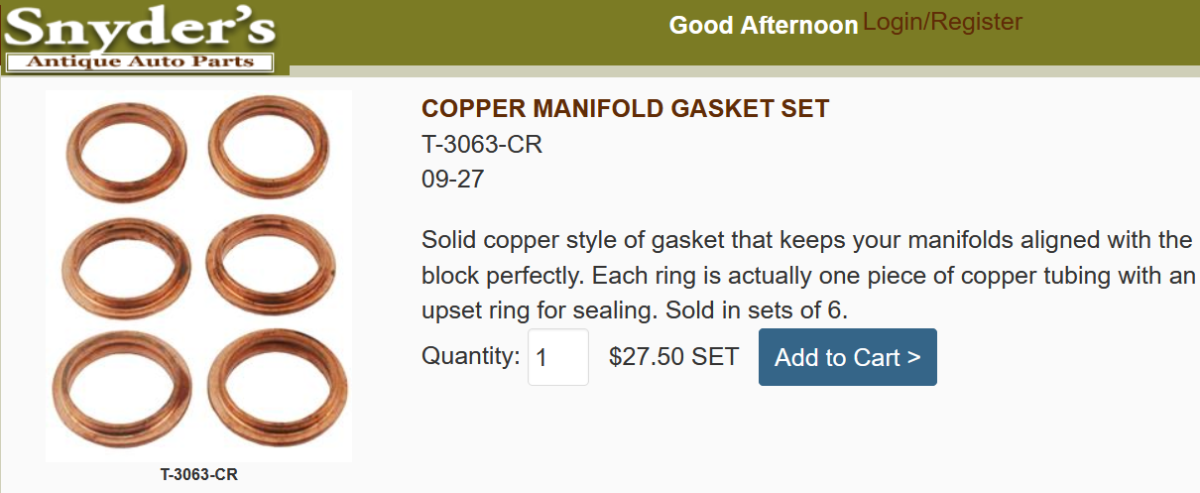 I could not agree more about the solid copper gaskets, absolutely excellent. I bought them years ago (ad in the MTFCA magazine at the time was the only way, I think) and have not any any leaks since. The best part, my grandson collects stamps and I asked that in lieu of printed postage would it be possible to use some Australian stamps instead so he could add them into his collection, they said they would do "their level best" to help. When the package arrived, no stamps on the outside but packaged up nicely along with the gasket sets was a very nice commemorative stamp set from Australia Post. Someone took the time and effort (not to mention money) and went to the Post Office to be nice to someone half a world away. Not just a great product, but also great people.