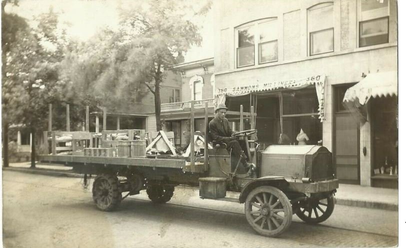 The proud driver's rig looks like one of a fleet ? I'd sure like to know the make and year. It's always amused me how many of the early trucks placed headlights high and on the cowl like this one. Perhaps to keep them out of harm's way in rough working situations ? The kerosene running lamps have a bail, indicating usefulness as a carry-around lantern when needed. Great photo !! Thanks again, Herb !!