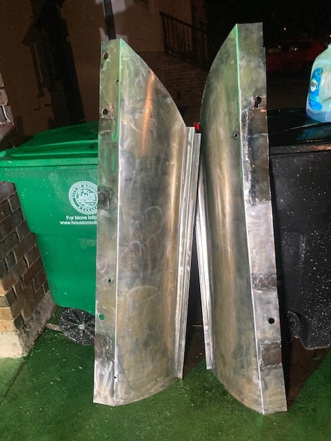 More progress. The skirts are welded, ground, stripped with Citri-strip then phosphoric acided and ready to paint. My amateur weld job should not show with the body on. The wire brush wheel on the grinder is very effective but flings steel hairs at me. Stripped paint goes everywhere too. I had to wash the other cars and garage door afterwards so that thrown bits of stripped paint don't strip the other cars and garage door. Some of them penetrate the skin on my legs like some weird acupuncture that I discover attached to me later and have to pull out.
