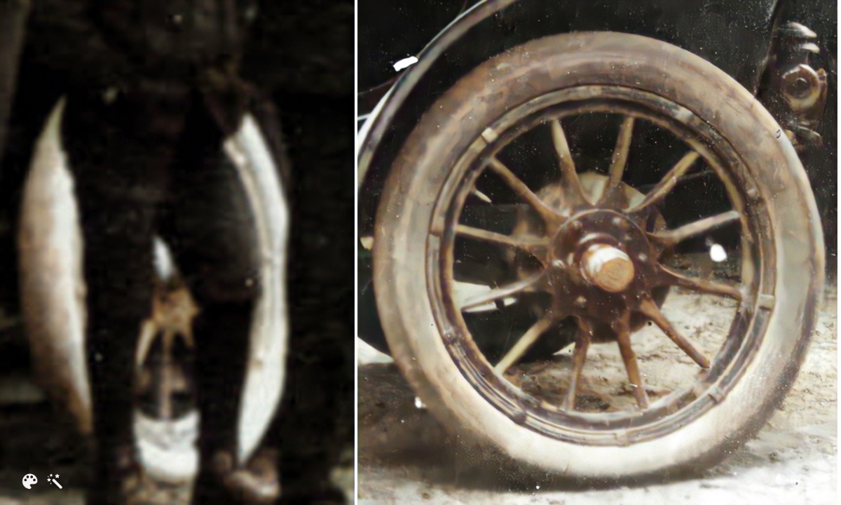 Just speculation offhand, the model K likely belongs to a local hotel or other business that caters to tourists and has their pictures taken in front of the tree. Not only is the top missing in the one photo, but the wheels have changed color (and I don't think that is a factor of the colorization program?). I am pretty sure I have seen a couple other black and white pictures of this same model K in front of this same tree before (I remember the unusual hood).