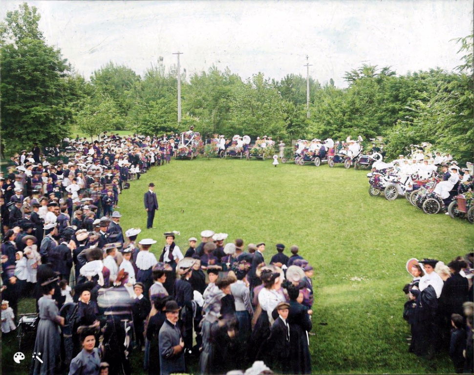 This photo shows the increased number of auto entries in the parade. The Ford "B" can be spotted by the big swan on the hood: