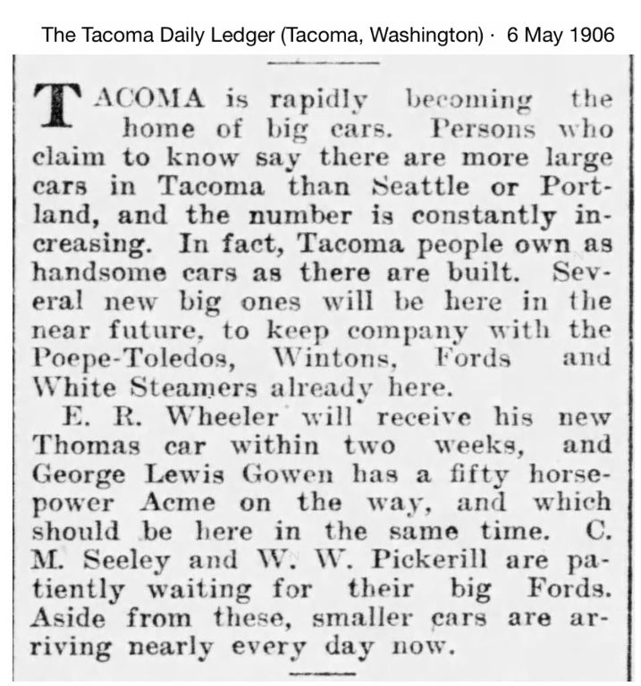 This article reports that by early 1906, Tacoma has 37 registered autos, and 13 are Fords: