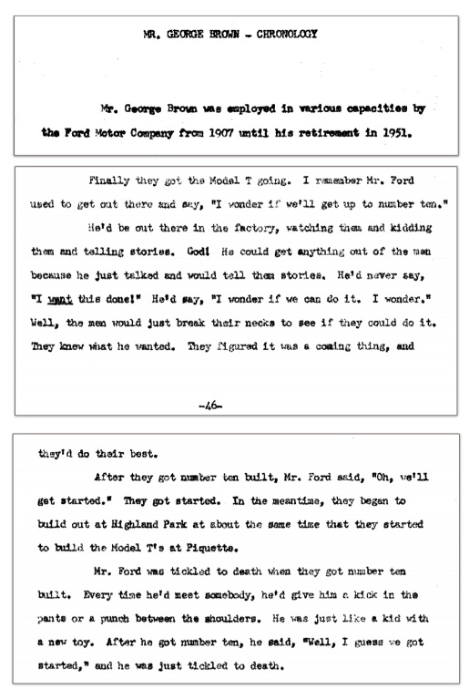 I couldn’t sleep, so started going through old Dropbox files and found this. It’s a partial (several pages) Reminiscence by George Brown, who worked for FMC from 1907-1951. He gives a warm and interesting view of what working for Henry Ford and FMC was like in the early years. The excerpt below is about getting the first 10 Model T built in 1908: