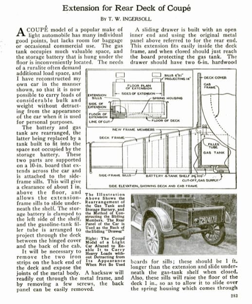 with brass railing installed in lieu of the rumble seat. You might consider that approach. I believe the are illustrations in the 1912 Ford manual but I could be wrong. Don Mari used to make them, but that was years ago.. I suspect one could make them with brass tubing and fittings available today and come close to the original. If the seat height on a commercial body is the same as a roadster, which I believe it is, you can install a round gas tank under the seat.