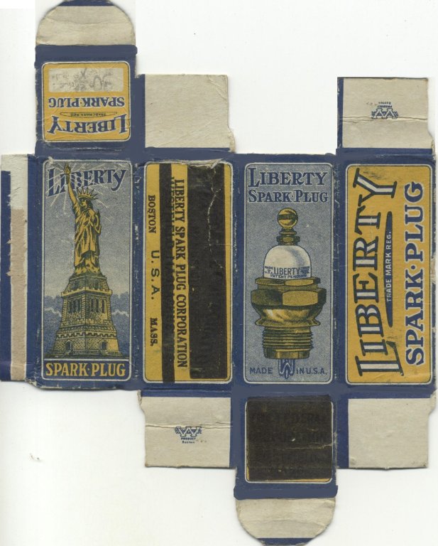 I picked up a tub of five Liberty "Dome Top" spark plugs for a Model T at Hershey this year. Now I'm hoping to make some boxes for them. I only found one picture online of what the box looks like, does anyone here have an original box they would be willing to part with, or flatten out and scan, or at least take good, straight-on pictures of all sides and the ends so that I can make new boxes for these plugs? Thanks!
