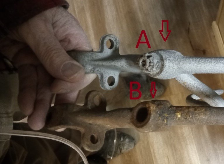 Sorry it took so long to post a reply but I was waiting for some pictures of the front fender irons I am inquiring about. I think the differences are pretty evident from the pictures and looking at the arrows. The irons I want to use are showing as "A" in the pictures, both irons are for forked mounted headlights. What years were forks "A" used on?