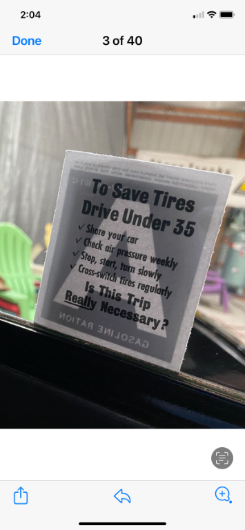 The folks I just restored the 22 for wanted the original gas ration sticker left on the windshield. They remembered the tire saving notice on the backside. The original was too fragile and came away with the masking tape so I replaced it with a reproduction. They are still deing made. Art