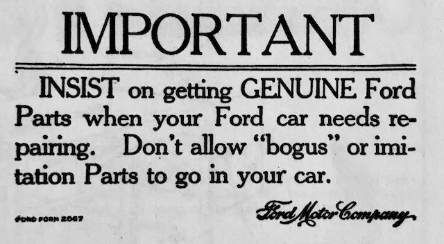There were a few of these stickers placed by dealers, early and later for starter equipped cars. The Use only Ford parts was a later add, mentioned in a Service Bulletin and offered to dealers from the Branches, to be placed in trunk lids to inform owners!