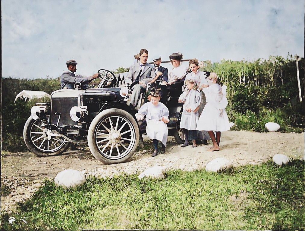 Early 1905 Model B (step plates, angular back doors, straight front crossmember with the crank passing under). Henry Ford driving and I believe early investor and director John Gray and family riding: