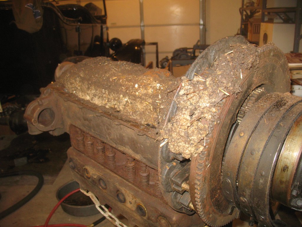 This engine came from a barn in Michigan and was sealed up except for the starter and generator holes. The car I bought out of the same barn was ankle deep in nuts and mouse debris so shouldn't be too much of a surprise I guess. I have a couple radiators I picked up and it looks like they were knitting sweaters inside of them, industrious little bastards.