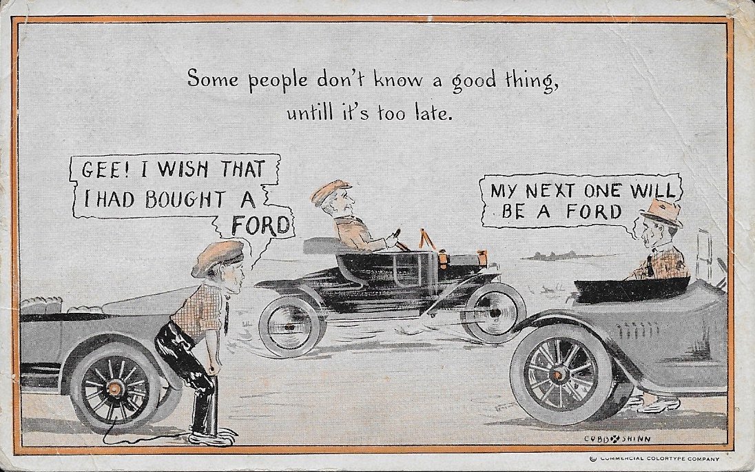It was about that time that Shinn came to the attention of the Ford Motor Company. It seems that Henry Ford recognized that the jibes at his Model T (first built in 1908) could be turned to his advantage. Shinn began providing humorous cards poking fun at the Model T. Henry Ford is reputed to have said that “every time someone laughs at a joke about the Model T, I sell another car.”"
