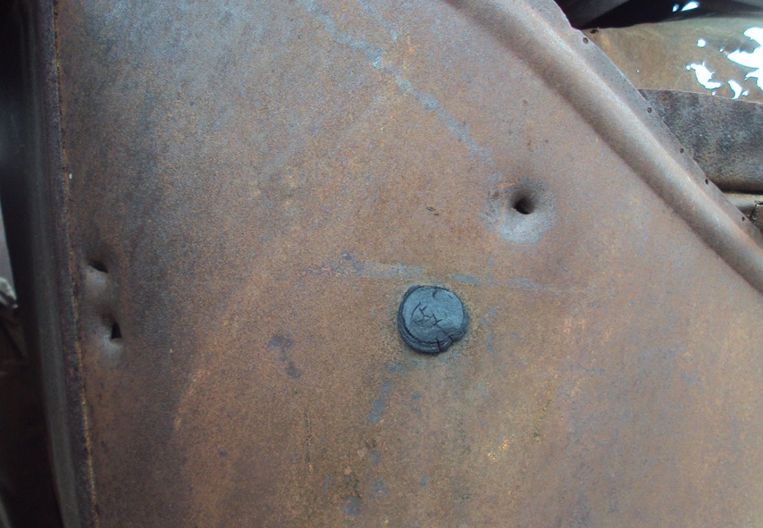 These plugs are original to my 1925, found as is in a barn in 1977. They were in an old tire patch canister, and they are aged for sure. Did place them sometime ago in the side panels when the arms were out. Used some glue on them to keep from falling out on the road, so that is the brown residue now on them.