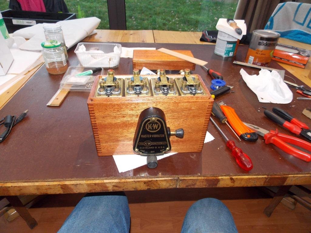On New Years day I finished building for our 1911 touring restoration project this Heinze ignition box sized to accept the more "modern" KW coils. I got the box from Snyder's and the KW coils fit well without shimming. I stained it with Track of the Wolf cherry stain which I will also use on the replacement firewall.