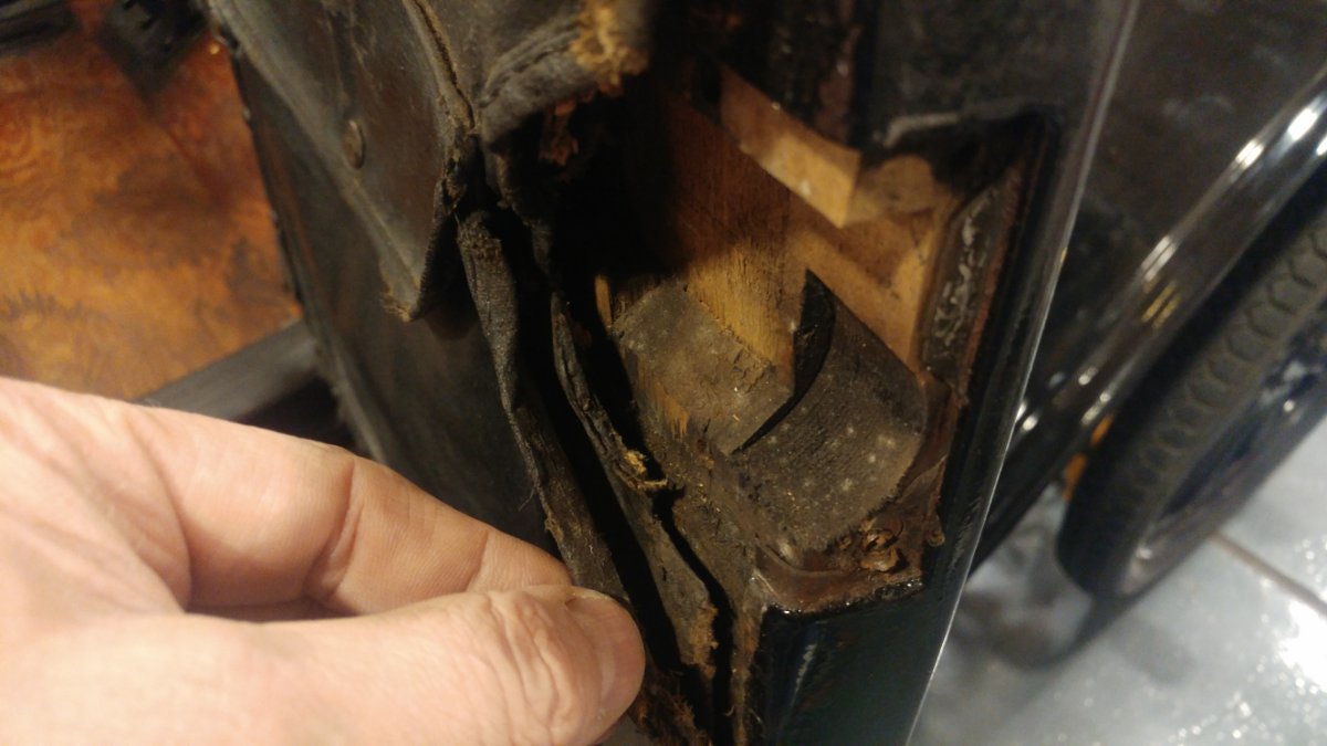 This makes me a bit nervous. After pulling all nails I found out that the door was covered twice from inner side. The first layer (in next picture on the right) is cardboard, coated with cloth on its front side (also glued 1" around all borders), and finally painted black. The left side inner cover of my Lizzy is of same material and not looking better. You can see all the damages, it is also very warped. I guess this was the reason for another layer...
