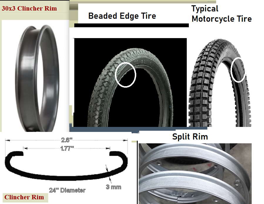 Like Allen says... tires need to match the rim design. The term "Motorcycle Tire" is insufficient to clearly describe the tires bead. Some have a beaded edge and some don't for mounting on the respective rim. I think you can se that the Typical Motorcycle Tire's edge doesn't match the clincher rim but might work on a split rim. The opposite would be true for a beaded edge tire