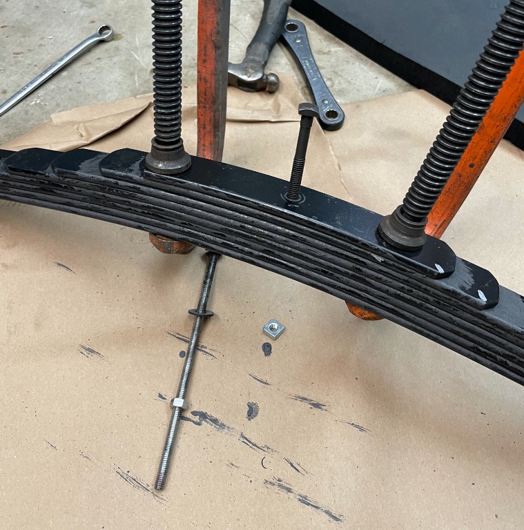 The center bolt I used did have at least a square head to go into the front crossmember, higher head factory would be best, but all my originals were too worn for reuse. The hex head that came in this nice new spring from T-Springs won’t fit into the crossmember. But those bronze or brass bushings installed as received are great!