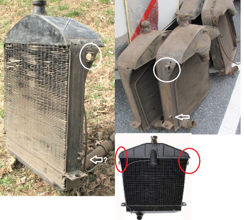 The radiator shell brackets are towards the top. Appears to be brackets near the bottom of the shell for hood aliment. Again the upper bolt only held in position in the slot allowing movement. My Borg radiator does not have the lower brackets (arrow). Best I could do for dimensions