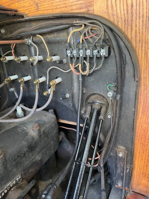 George, The 22 I took apart had four clips on the firewall. Both firewall to frame brackets had a clip behind the top nut, one in the top center at the radiator support rod, and a shallow clip that that attached on the lower driver side coil box bolt to the firewall. That clip was very shallow and only held the magneto wire coming from the coil box mag post through a small hole to the mag post on the hogshead. My after picture has the clip in the wrong location on the horn bracket. Art