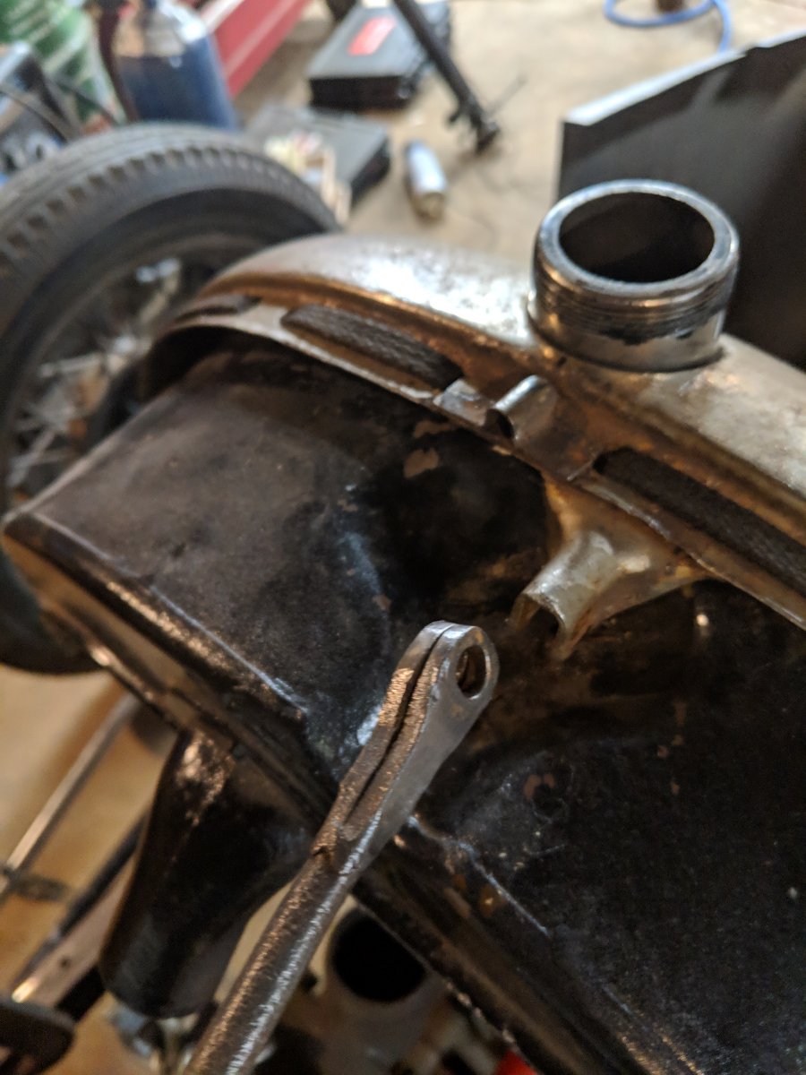 Not much but I was sitting on the couch contemplating going to the hardware store to buy steel rod for a radiator support. I decided to go downstairs and see what I had already. I found an old brake rod and thought it might work. After smashing it flat and a little grinding it fit into the Whippet shell perfectly. I just have to thread it and add nuts and washers.