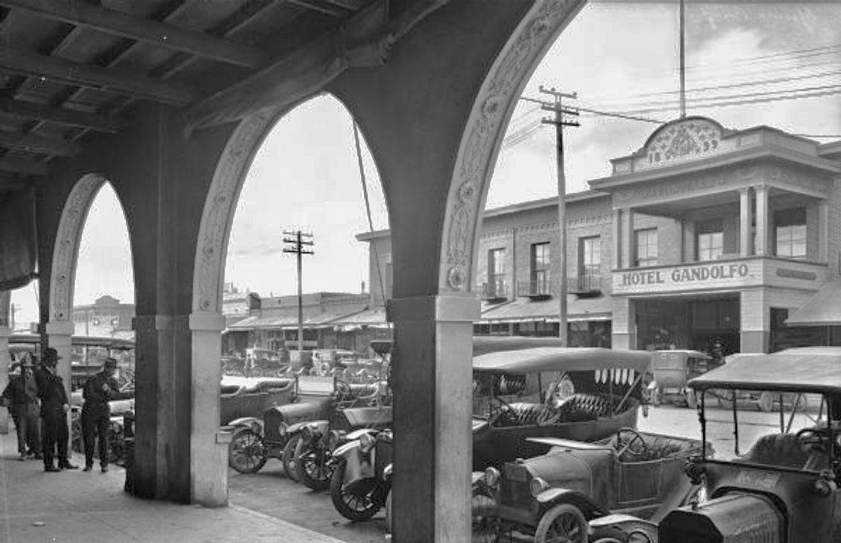 About a half block up from the Snow Flake Bakery, it looks like a could be model T speedster in the street?