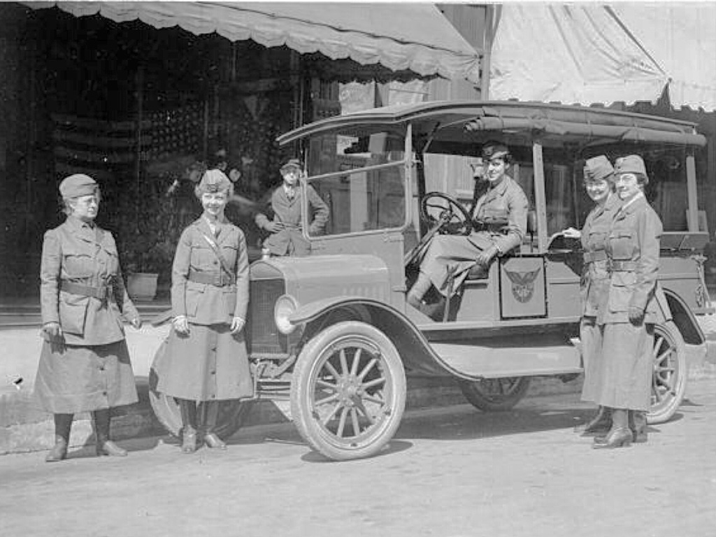 The ambulance is from the American Field Service, around 1915-16, an early model ambulance body, brass rad, acetylene lights.