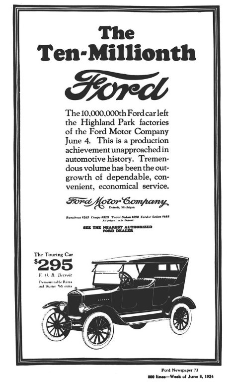 I believe the record low price F. O. B. Detroit was $265.00 for the 1926 roadster. By then, I'm pretty sure that included self starter and demountable rims. ?!?
